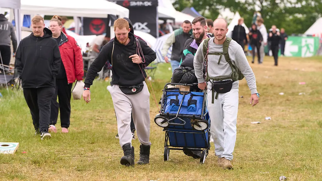 Nürburg (dpa/lrs) - Der Wind schüttelt die Zelte durch, die kurzen Regenschauer erschweren die Sicht. Die Fans trotzen dem Wetter und strömen in Massen zum Nürburgring in der Eifel. Rock am Ring wartet, aber der Regen auch - und das im Jubiläumsjahr.