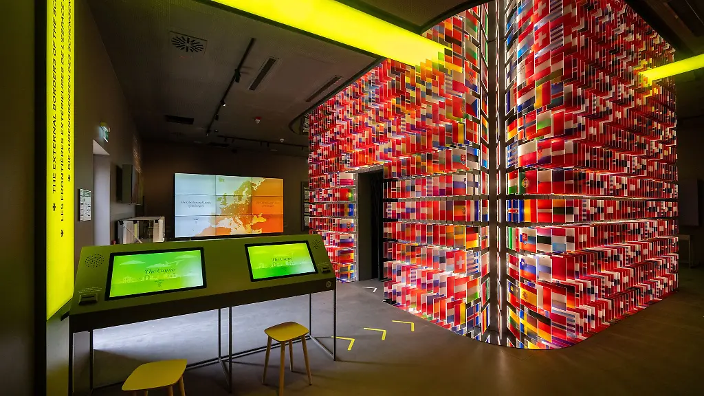 Vieles geht interaktiv: Man bekommt eine Chipkarte beim Einchecken, mit der man am Bildschirm zwischen Deutsch, Englisch und Französisch wählen kann. Herzstück der Ausstellung ist ein mit Hunderten Fahnen der Schengen-Länder ummantelter Raum, in dem Besucher Kurzfilme mit persönlichen Geschichten von Menschen sehen, die mit offenen Grenzen leben.
