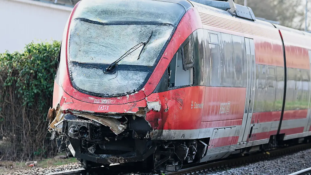 Der-Regionalzug-mit-beschaedigter-Front-steht-am-Bahnhof-auf-den-Gleisen