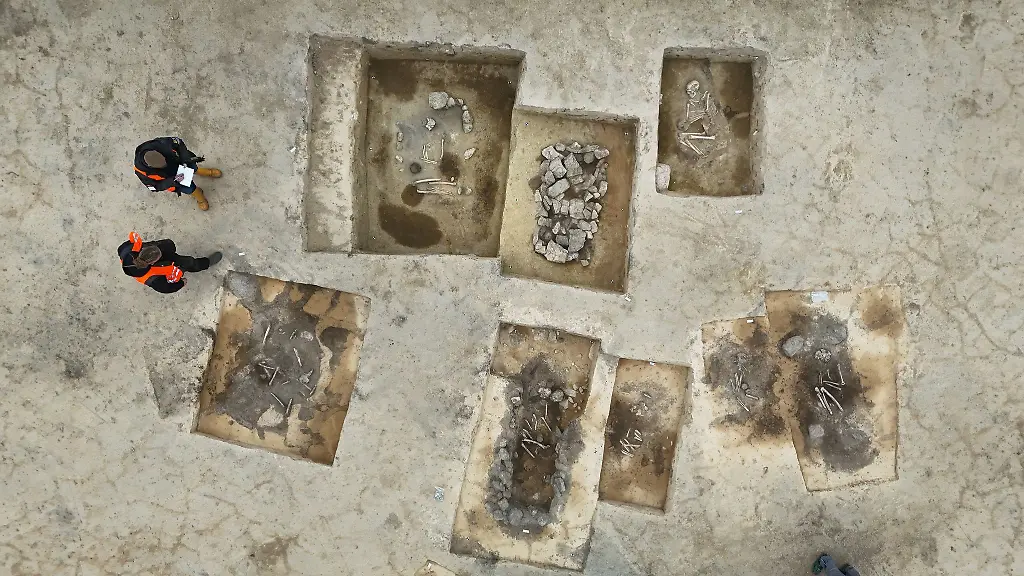 Als Beigaben seien jedoch nur einfache Keramikgefäße gefunden worden, wohl für "die Mitnahme von Speis und Trank auf die Reise ins Jenseits", sagte der Archäologe. Die beiden als Steinkisten ausgeformten Särge liegen zwar nicht in der gleichen Zeile, stießen jedoch unmittelbar aneinander. Ob die beiden darin niedergelegten Toten miteinander verwandt waren, werden erst genetische Untersuchungen aufzeigen.