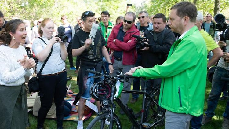 Kretschmer war am Samstag unangekündigt in Begleitung weniger Mitarbeiter mit dem Fahrrad in den Großen Garten in Dresden gefahren, um mit den Menschen zu sprechen. Dabei war er zum Teil dicht umlagert, wurde bedrängt und auch beschimpft.