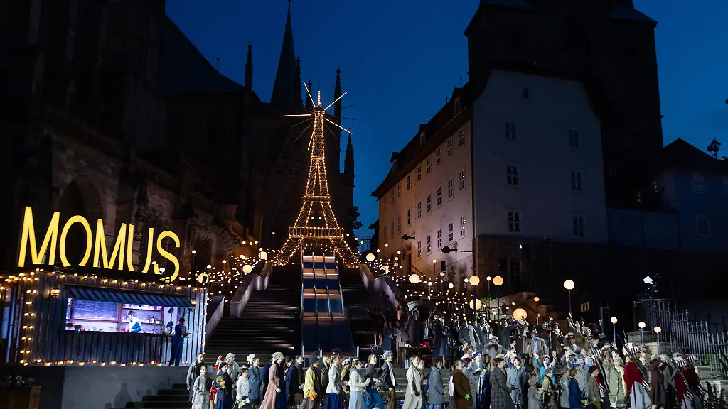 Eine gute Nachricht hat Becker zudem für diejenigen, die sich besonders für die ins Bühnenbild integrierte 23 Meter langen Rutsche begeistert haben. Auf den Bahnen der Rutschen glitten während der Vorstellung die Mitwirkenden eines Kinder- und Jugendchors die Domstufen hinab. Die Rutsche und auch das zur Kulisse gehörende Modell des Eiffelturms haben Becker zufolge einen Nachnutzer gefunden und sollen auch in Thüringen bleiben. Wo genau, verriet sie noch nicht.