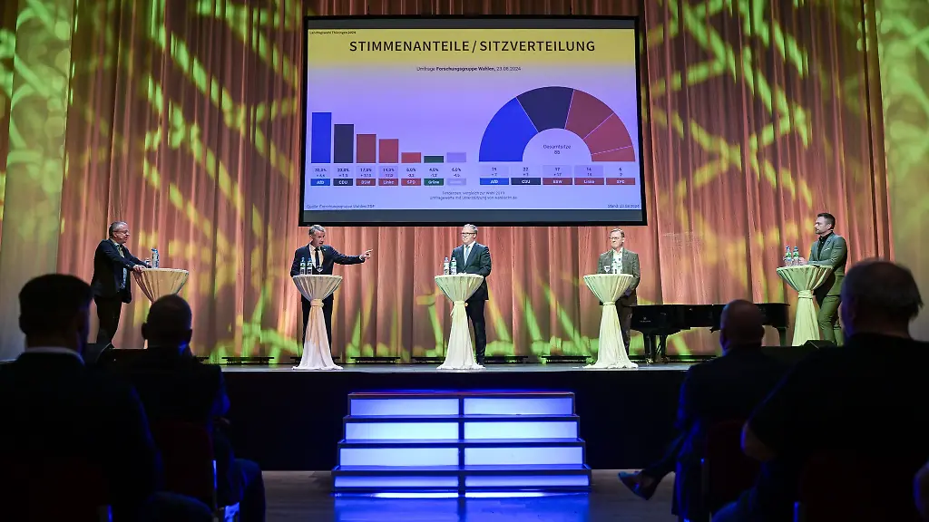 Bei der Diskussion kam es zu heftigen Wortgefechten zwischen AfD-Spitzenkandidat Björn Höcke und Ramelow, aber auch Höcke und dem CDU-Spitzenkandidaten Mario Voigt. "Dass Sie hier noch stehen, ist eine Zumutung für viele Menschen", sage Höcke zu Ramelow. "Das geht mir genauso", erwiderte der Angegriffene.