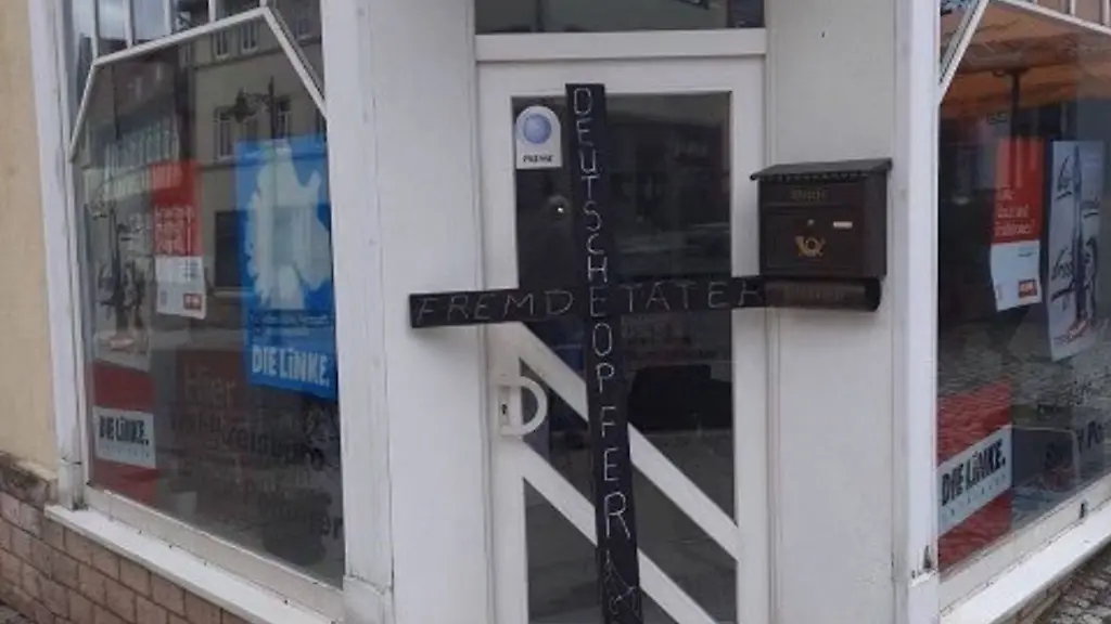 Bleicherode (dpa/th) - Unbekannte haben ein schwarzes Holzkreuz vor dem Wahlkreisbüro von Landtagspräsidentin Birgit Pommer (Linke) in Bleicherode (Landkreis Nordhausen) aufgestellt. Darauf ist die Aufschrift "Deutsche Opfer, Fremde Täter" zu sehen sowie ein gemaltes Messer, von dem Blut zu tropfen scheint, wie die Polizei bestätigte. Ein ähnliches Kreuz sei an der nahe gelegenen Autobahn 38 gefunden worden. Es gehe offenbar um politisch motivierte Kriminalität, sagte ein Polizeisprecher.