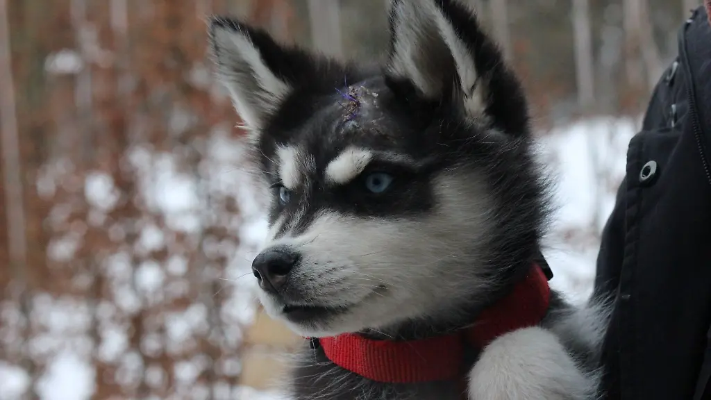 Der ungefähr zehn bis zwölf Wochen alte Husky mit den hellblauen Augen war Anfang vergangener Woche im Bereich des Buchenwalds gefunden und in eine Tierarztpraxis gebracht worden. Er wies schwere Verletzungen an Kopf und Kiefer auf.