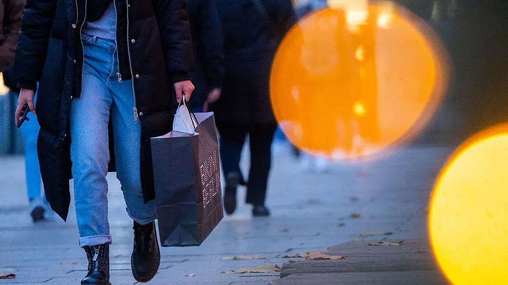 Eine-Passantin-geht-mit-Einkaufstueten-durch-eine-Einkaufspassage