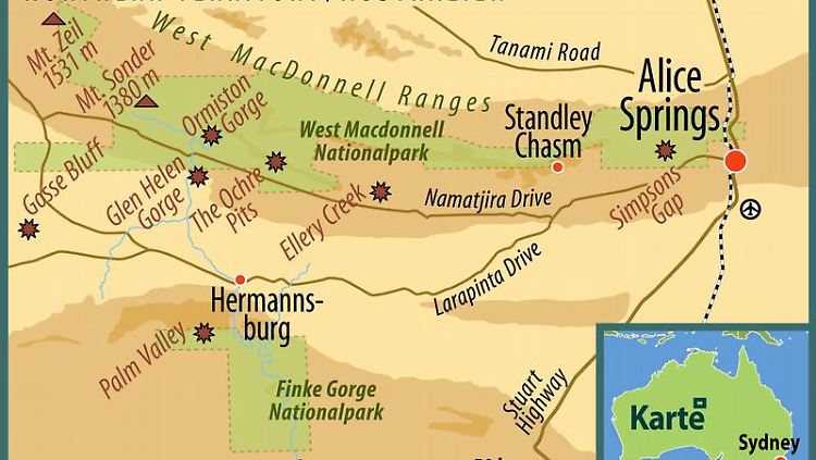 Auch die Straße von Alice Springs nach Glen Helen wurde nach dem Maler benannt: Der "Namatjira Drive" führt durch eine breite, wellige Ebene mit rostroten Bergketten zu beiden Seiten, in denen sich interessante Ausflugsziele verstecken, etwa das Simpsons Gap, ein Durchlass in den Felsen nur 18 Kilometer von Alice Springs entfernt. Hier gibt es ebenso gute Möglichkeiten für kurze Wanderungen wie 115 Kilometer weiter westlich an der Ormiston Gorge, wo drei Wege in die Schlucht und um sie herum führen. Zwischen den beiden Schluchten liegt Standley Chasm, eine sechs bis zehn Meter schmale Felsspalte, in der die Sonne nur mittags für kurze Zeit den Boden erreicht.