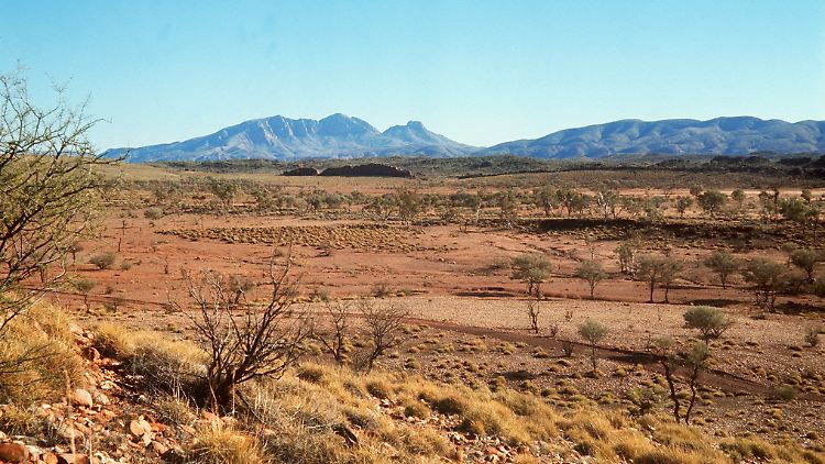 Bis zum Sonnenuntergang dauert es nicht mehr lange. Die vielen kleinen Fliegen nerven - aber die Farben der Landschaft, die sich alle paar Minuten ändern, faszinieren: In dunklem Purpur leuchten die Felsen, jenseits des sattgrünen Buschlandes und des Flussbettes des Finke River mit dem Sandufer ist der 1380 Meter hohe Mount Sonder zu sehen. Diese Aussicht von einem der Hügel nahe der Glen Helen Gorge hatte auch Albert Namatjira oft vor Augen: Die roten Felsen der MacDonnell Ranges und die "Ghostgum"-Eukalyptusbäume verewigte er viele Male.