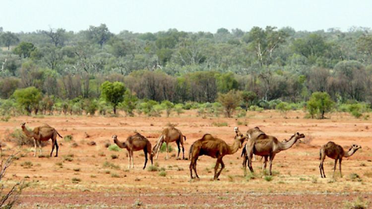 Eine Herde wilder Kamele streift durch das australische Hinterland zwischen Alice Springs und Ayers Rock.