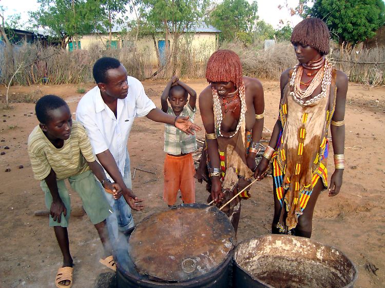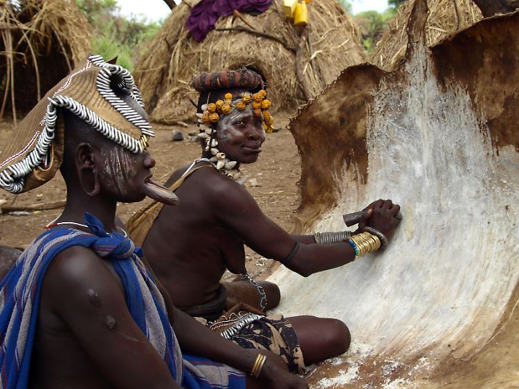 Eine gute Fahrstunde vom Ort Jinka entfernt machen sich Frauen vom Volk der Mursi schick fürs Foto. Sie rücken ihre Dhebi zurecht, die Lippenteller aus Ton. Wer die Frauen fotografieren will, muss umgerechnet rund einen Euro bezahlen. Mit dem Geld aus dem Fototourismus gleichen die Mursi schlechte Ernten aus - und die sind in Äthiopien nicht selten.