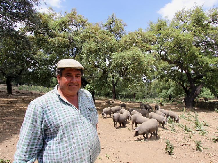 Nach der Muttermilch werden die langbeinigen Schweine mit den spitzen Rüsseln und den dunklen Borsten vorwiegend mit Getreide gefüttert und fressen auf den Wiesen und Weiden Wurzeln, Knollen, Gras und Kräuter. Zwischen November und Januar ernähren sie sich dann hauptsächlich von den herunterfallenden Eicheln. "Bis zu zehn Kilo Eicheln fressen die Tiere täglich", erklärt Schweinebauer José Antonio Macías Sánchez - und nehmen so bis zu einem Kilo pro Tag zu.