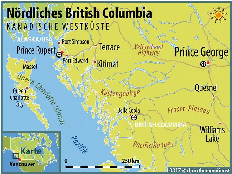 So anders die beste Gaststätte am Platz aus der Sicht eines Mitteleuropäers erscheint, so anders sind auch das ganze Städtchen Prince Rupert und die Region drumherum. Das zeigt sich schon bei der Ankunft. Eine Stunde benötigt die Propellermaschine von Vancouver. Dabei überfliegt sie eine traumhaft unberührte Natur: Die Gipfel der Rocky Mountains türmen sich auf, durchzogen von vielen Flüssen - kaum vorstellbar, dass jemals Menschen einen Fuß dorthin gesetzt haben.