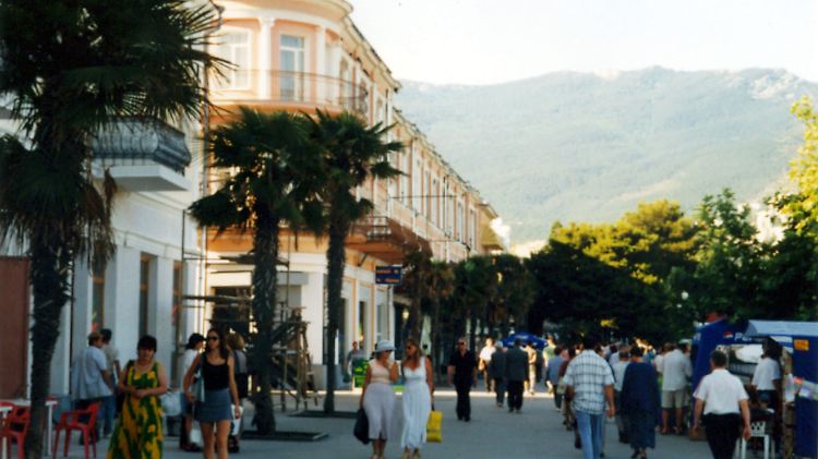 Vor dem Hotel Marino schlendern Touristen und Einheimische über die Strandpromenade der Hafenstadt Jalta.