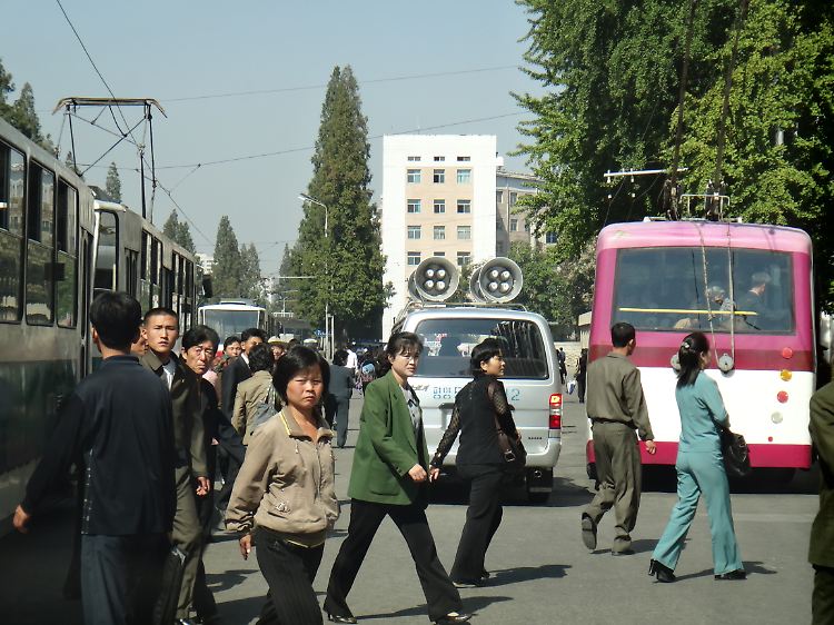 Es ist ein Grau in Grau in der Hauptstadt, zum größten Teil Plattenbau, mit wenigen Ausnahmen in der Pjöngjanger Innenstadt - was die Nordkoreaner dann auch stolz präsentieren. Außerdem sieht man Parolen für das Militär und das Volk und natürlich die Porträts von der Kim-Dynastie. Alles andere ist einfach grau. Es gab auch kleine Minibusse, die mit Lautsprechern ihre Propaganda verbreiten - auch so ein echter Klassiker. Man hat eine ständige Beschallung der eigenen kreierten Welt, sodass die Bürger immer wieder daran erinnert werden.