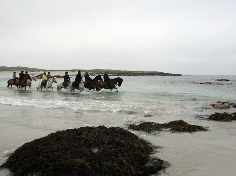 Nach Tagen im Sattel sowie Nächten in altmodischen Landhäusern und Schlosshotels ist der Atlantik erreicht. Die Gischt schäumt in der Mannin Bay bei Clifden. Die Pferde waten tapfer durch die Wellen. Und dann können auch sie ihn kaum erwarten, den langen Galopp am Strand.