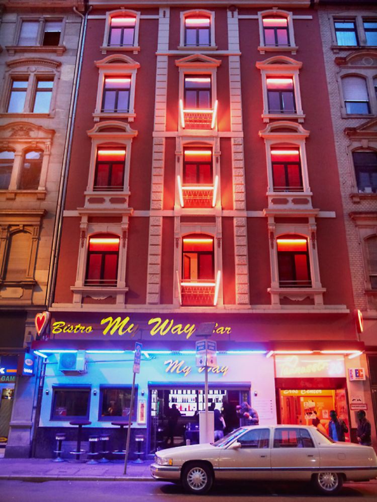 Die Lichter sind bereits vielsagend: Diese Laufhaus steht in der Taunusstraße im Frankfurter Bahnhofsviertel.