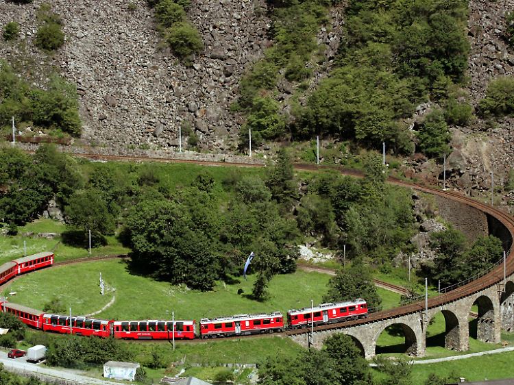 Ein Zug der Rhätischen Bahn (RhB) durchfährt das Kreisviadukt der Berninalinie bei Brusio im Puschlav im Kanton Graubünden.