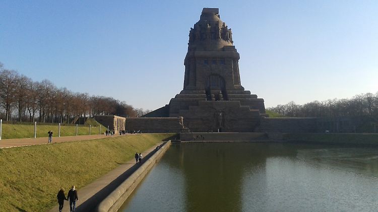 Weiter gehts. Das alte Rathaus auf dem Markt ist ein herrlicher Platz, bei diesem schönen Wetter möchte ich dort am liebsten gleich wieder Kaffee trinken gehen. Aber ich verzichte. Ich erkundige mich nach dem Weg zum Völkerschlachtdenkmal, setze mich in die Linie 15 und fahre etwa zehn Minuten mit der Tram aus der Stadt heraus. "Völkerschlachtdenkmal" röhrt es aus dem Lautsprecher. Dann sehe ich diesen Koloss von Denkmal. Ich bin schwer beeindruckt von dieser Anlage, die an die große Völkerschlacht von 1813 erinnert. 91 Meter ragt es in die Höhe - und einen Teil des Aufstiegs lege ich zu Fuß zurück. Auf den letzten Metern ist es allerdings sehr eng im Aufgang. Nur als kleiner Tipp: Wer an Klaustrophobie leidet, sollte nicht bis ganz oben laufen.