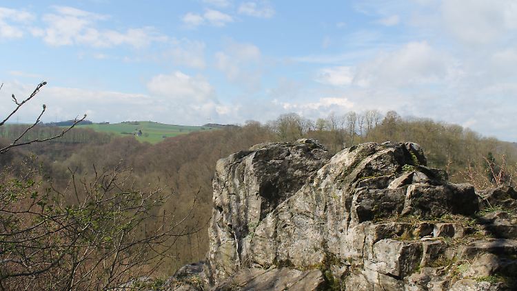 Nach der fünfminütigen Aufregung und Entzückung rund um den Waschbärennachwuchs gönnen wir uns eine kleine Pause. Ranger-Begleithund Carlos, eigentlich Franzose, aber mit spanischem Namen, muss angebunden werden, denn am Aussichtspunkt Kuckucksfelsen geht es einige Meter steil nach unten. Das hier ist definitiv nichts für schwache Nerven. Ich entscheide mich dafür, kein zweites Mal runterzublicken. Dafür schaue ich mir die Aussicht an - auch die Sonne zeigt sich püntklich. Das ist es, das wahre Wandererglück: Pause mit Aussicht und Sonne. Nun geht es bergab, auch hier ist ein guter Halt wichtig.