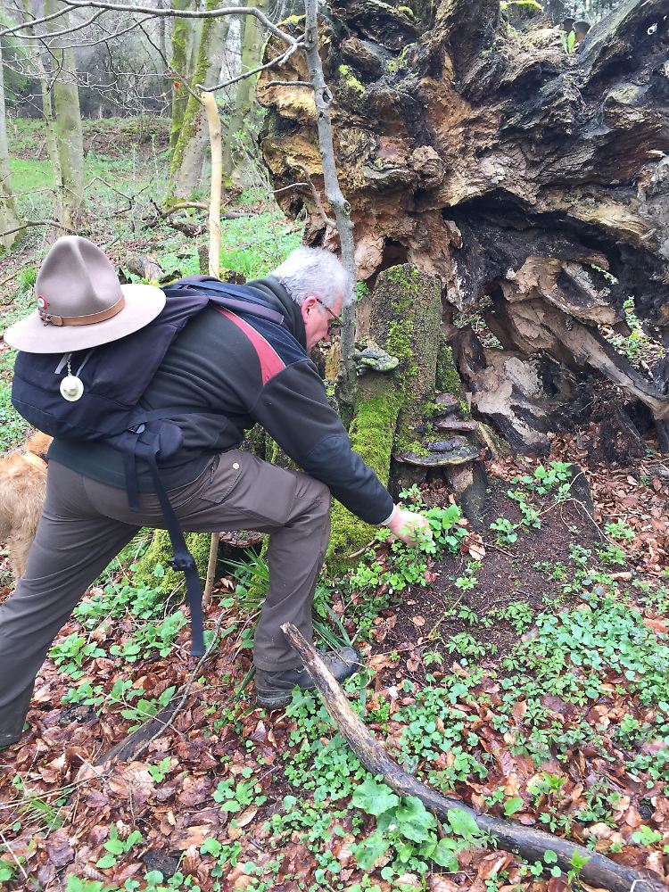 Ein netter Mann im Förster-Outfit und mit Jagdhund Carlos an der Leine begrüßt den Rest der Wandergruppe und mich herzlich. Jörg Pahl ist Ranger. Sein Job ist es, Wanderern die Natur zu zeigen, ihnen den Weg zu weisen. Früher war er Lehrer an einer Ausbildungsstätte für Förster, seit ein paar Jahren ist er Ranger und ist täglich in der Natur Südwestfalens unterwegs - und man merkt ihm seine Begeisterung an. Er gibt Führungen für Erwachsene, Kinder und Schulklassen.