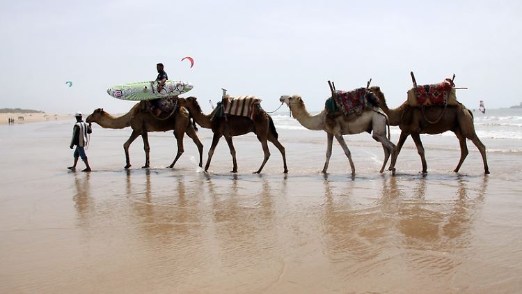 Ibrahim zieht kurz, aber heftig an der Leine. Das Kamel geht sofort in die Knie und setzt sich in den Sand. Mit einem Schwung springt Said auf den Sattel. Er muss die Balance halten, als sich das Tier wieder aufrichtet. Ibrahim reicht ihm das Surfbrett hoch. Gemächlich trottet das Kamel los, das Wasser platscht unter seinen großen Hufen. "So exotisch kann Surfen in Marokko sein", sagt Said.