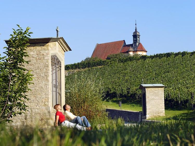 Von der Religiosität der Menschen zeugen auch die vielen Sandstein-Bildstöcke in den Weinbergen flussaufwärts. Die landschaftlich reizvolle Strecke zu den Winzerorten Sommerach und Nordheim mit ihren elegant gestylten Vinotheken verläuft kilometerlang vorbei an Rebhängen. Die beiden Dörfer liegen seit dem Bau des Mainkanals wie auf einer Insel.