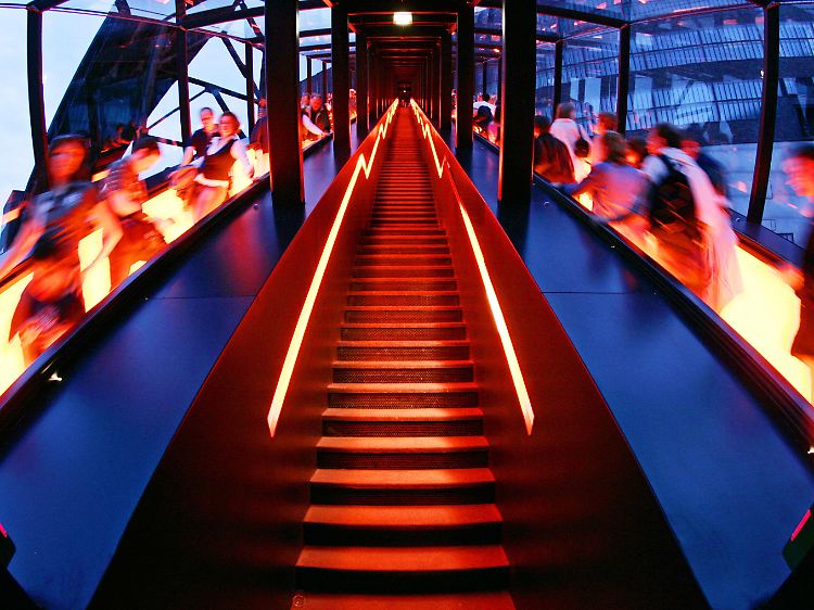 Über eine beleuchtete Rolltreppe haben Besucher der "ExtraSchicht" auf Zeche Zollverein in Essen einen nächtlichen Blick auf das Gelände. (Archiv)