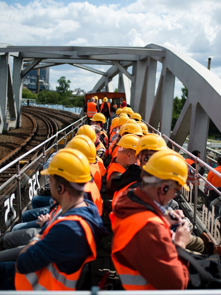 Einsteigen bitte! Vor der Abfahrt gibt es noch für alle Mitfahrer gelbe Helme und Kopfhörer. Punkt 19.00 Uhr springt das Signal auf Grün. Zwei Stunden lang fährt die Bahn kreuz und quer durch die Hauptstadt. Zum Start gibt es noch die nötigen Sicherheitshinweise. Am wichtigsten - trotz der gelben Helme, die jeder Teilnehmer tragen muss: "Während der Fahrt bitte nicht aufstehen", ermahnt die Stimme im Lautsprecher, die sich als "Herr Jäger" vorstellt und in den kommenden zwei Stunden kaum aufhört zu reden. Extra für das U-Bahn-Cabrio ist die Beleuchtung in den Tunneln eingeschaltet.