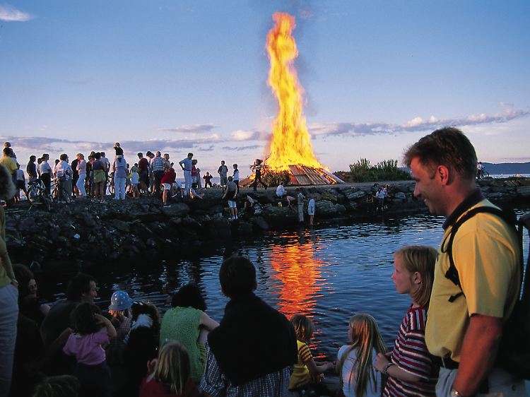 "Wir feiern das Fest nicht nur anlässlich der längsten Nacht des Jahres", erzählt die Fremdenführerin Margareth Sveen. "Wir zünden dann auch große Feuer an, um die Hexen zu verscheuchen, die sich in dieser Nacht treffen." Doch damit nicht genug: "Ein alter Glaube besagt, dass junge Mädchen verschiedene Pflanzen pflücken und in dieser Nacht unter ihr Kopfkissen legen müssen. Dann träumen sie von dem Mann, den sie heiraten werden", sagt Sveen. Daran glaubt heute wahrscheinlich niemand mehr so wirklich, dennoch sind auch bei diesen Feiern zur Mittsommerzeit viele Mädchen und junge Frauen zu sehen, die selbst gesteckte Blumenkränze im Haar tragen.