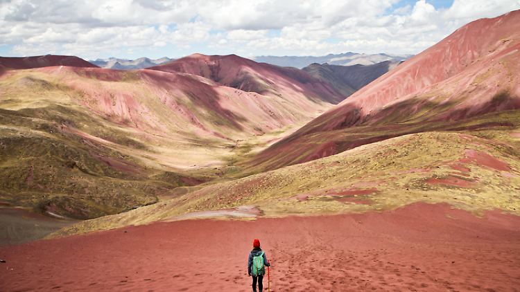 Erst seit einigen Monaten könnten Touristen das Tal überhaupt passieren, sagt der Guide. Viele der Pfade haben Alpaka-Herden in den Boden gestampft, der Massentourismus ist hier noch ganz weit weg Die Wanderung führt zunächst steil und ohne klaren Weg bergab durch eine Unmenge an rotem Sand, der der Asche eines Tennisplatzes ähnelt. Auf einem Berghang grasen Vicunjas, eine Art wilde Bambi-Version des Alpakas. Ein angeleintes Pferd steht mitten im Tal herum. Auch Guillermo blickt für einen Moment in die Ferne. "Schön, oder?", sagt er in seinem nicht perfekten Englisch. Dann grinst er.
