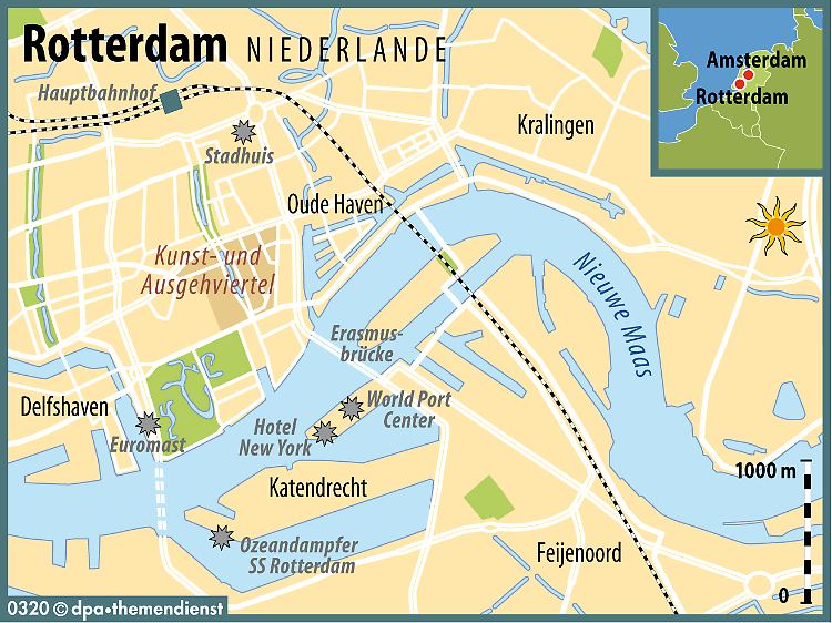 Den schönsten Blick über das "Manhattan an der Maas" bietet der Euromast. 1960 zur Eröffnung der Gartenschau Floriade fertiggestellt, punktet der Turm im europäischen Vergleich zwar nicht unbedingt mit überragender Höhe - es sind 185 Meter bis zur Spitze. Aber die Lage ist traumhaft, mit Blicken bis zur Nordsee. Unten geht man am besten zum nahen Pier der Wassertaxis. Diese oft von alten Hafenarbeitern gesteuerten, gelb-schwarzen Flitzer rasen in einem Wahnsinnstempo über die Wasserstraßen.