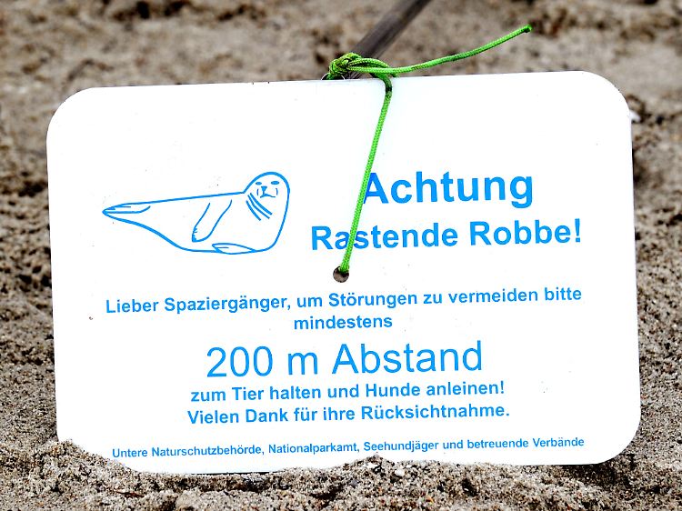 Vor dem provisorischen Areal steht ein Schild "Achtung Rastende Robbe! Lieber Spaziergänger, um Störungen zu vermeiden, bitte mindestens 200 Meter Abstand zum Tier halten." Doch das ist Illusion. Bis auf wenige Meter nahe sind die Touristen, oft scheinen sie nicht zu wissen, dass Seehunde Raubtiere mit scharfem Gebiss sind und in Bedrängnis auch zubeißen können.