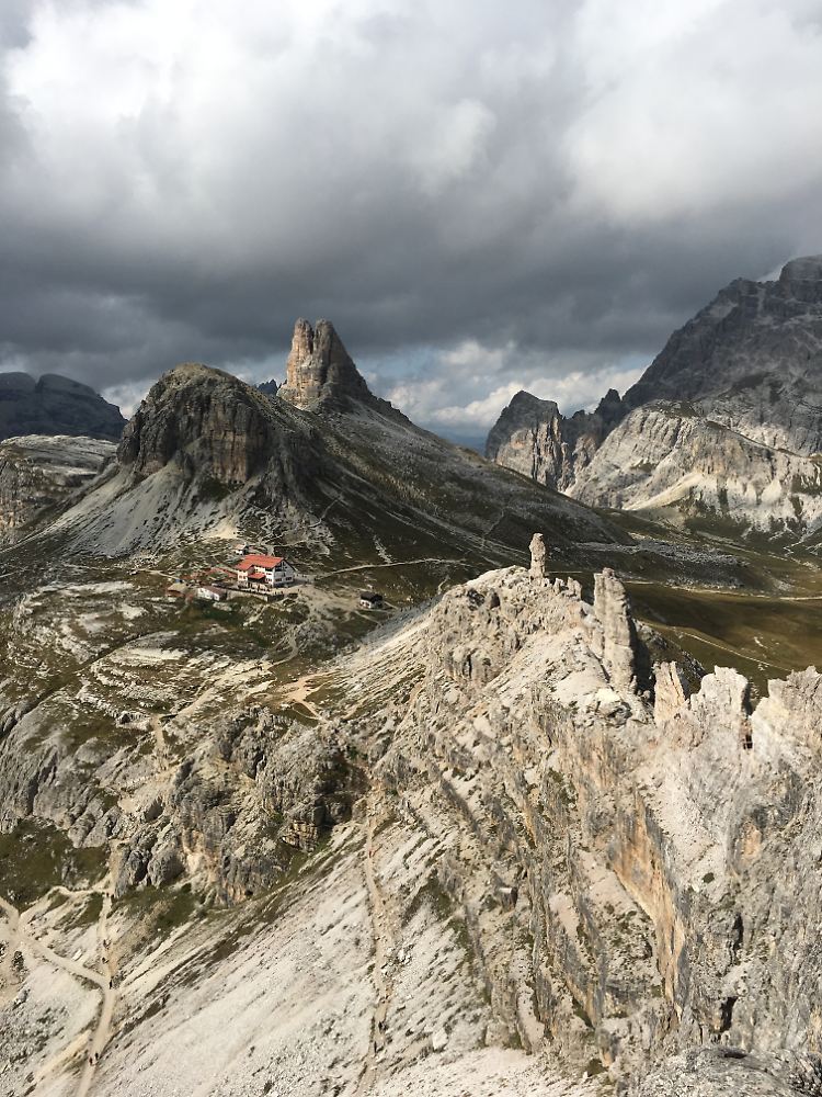 Der Blick von der Drei-Zinnen-Hütte ist atemberaubend. Auf der einen Seite ragen die Wahrzeichen der Region, die drei Steinzinnen, fast 3000 Meter in die Höhe, auf der anderen erstreckt sich nicht weniger mächtig der 2744 Meter hohe Paternkofel mit seinen so typischen Felsformationen in den Himmel. Davor das "Frankfurter Würstl", wie der markante Steinfinger liebevoll genannt wird. Alles hier ist schroff und hart, auf die ganz spezielle Art der Dolomiten - hervorgebracht durch das nur hier vorkommende Dolomit im Fels.
