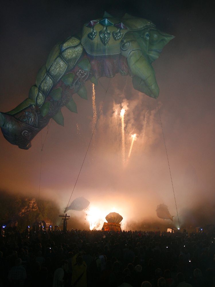 Bei der "Extraschicht" im letzten Jahr: Figuren des Himmelstheater "Plasticiens Volant" schweben am Himmel über der Henrichshütte in Hattingen.
