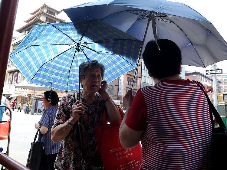 Der Regenschirm! Nicht gegen Regen, sondern als Sonnenschirm tragen viele New Yorker(innen) den kleinen Schwarzen mit sich herum, auch wenn die High-Tech-Stoffe etwas unter der Hitze leiden und leicht durchhängen. Kein Wunder in einer Stadt, die auf der Höhe Neapels liegt, also vom Breitengrad her.