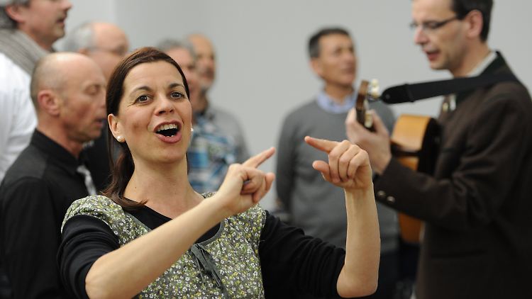 Die Stimmung im eher nüchternen Probenraum ist super. Zwar sind nur rund 20 Männer dabei, die sich aber von der Übermacht der Frauen nicht einschüchtern lassen. Bald wird zwei- und dreistimmig gejodelt. Über einen Teilnehmer sagt Lehrer Höhenleitner begeistert: "Der hat Chancen für Bayern sucht den Jodel-Star."