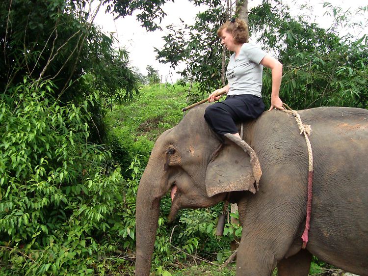 Gäste und Elefanten-Fans aus Leverkusen, Berlin, Hamburg, Zürich, Wien und Sidney bestätigen das, auch die Unternehmensberaterin Bianca Horna aus Frankfurt am Main. Die 39-Jährige sitzt ganz entspannt auf "Mae Geo", die beim Dschungelausritt gerade wieder eine Naschpause einlegt und am Bambus zupft. Horna liebt seit ihrer Kindheit Elefanten. Ausritt, Lenken, Führen, Wenden auf engem Raum, auch Stämmestapeln, Baden und Waschen im Fluss sowie das Aufschnallen des Sitz- und Lastenkorbs gehören zum 14-tägigen Kurs mit den grauen Riesen.