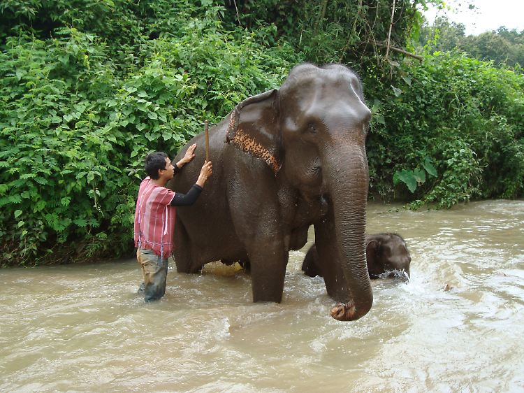 "Bei der Geburt war der Nachwuchs 100 Kilo schwer, heute bringt er fast das Doppelte auf die Waage", erklärt Tam. Bis der junge Elefant das Gewicht der Mutter von 2,5 Tonnen erreicht, dauert es noch eine Weile. "Jungtiere sollten wenigstens vier Jahre bei ihrer Mutter bleiben dürfen", sagt später Bodo Jens Förster. In vielen Camps und auf Farmen würden Elefanten zu früh getrennt. "Das schadet ihrer Entwicklung." Der Deutsche ist froh und stolz, dass sich bei ihm die Dickhäuter wohlfühlen. Acht ausgewachsene Elefanten, davon ein Bulle, leben im Camp, außerdem fünf hier geborene Jungtiere. Bis auf ein Tier sind alle Elefanten, die mit Touristen arbeiten, gemietet. Die Eigentümer leben in einem Dorf an der Grenze zu Birma.