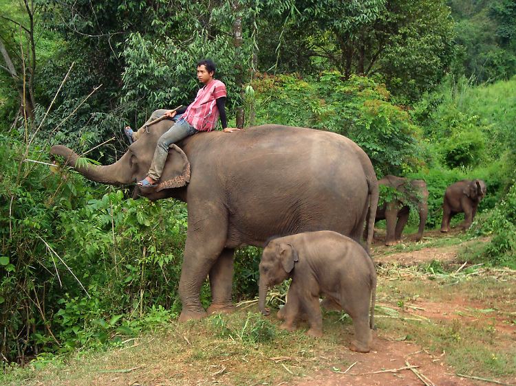 Ein älterer Berliner, der im Camp einen kurzen Schnupperkurs macht, schaut bewundernd zu. Er ist froh, dass er nicht selbst steuern und rufen muss und seine Elefantendame "Mae Geo" folgt. Es geht einen Teakholzhain steil bergab. Der Berliner klammert sich an seinen Sitzkorb, damit er nicht nach vorn rutscht und auf Mahout Tam. Der 20-jährige Karen sitzt auf dem Nacken des Tieres, hält mühelos Balance und steuert seinen Elefanten lässig mit den Schenkeln. Das Stöckchen mit stumpfen Haken muss er bei Elefantenmutter "Mae Kam Noi" kaum einsetzen. Sie ist 17. Ihr sieben Monate altes Baby läuft immer um sie herum, zupft auch spielerisch an Blättern und Ästen, frisst davon aber nichts, sondern macht hin und wieder einen Milchstopp bei der Mama.