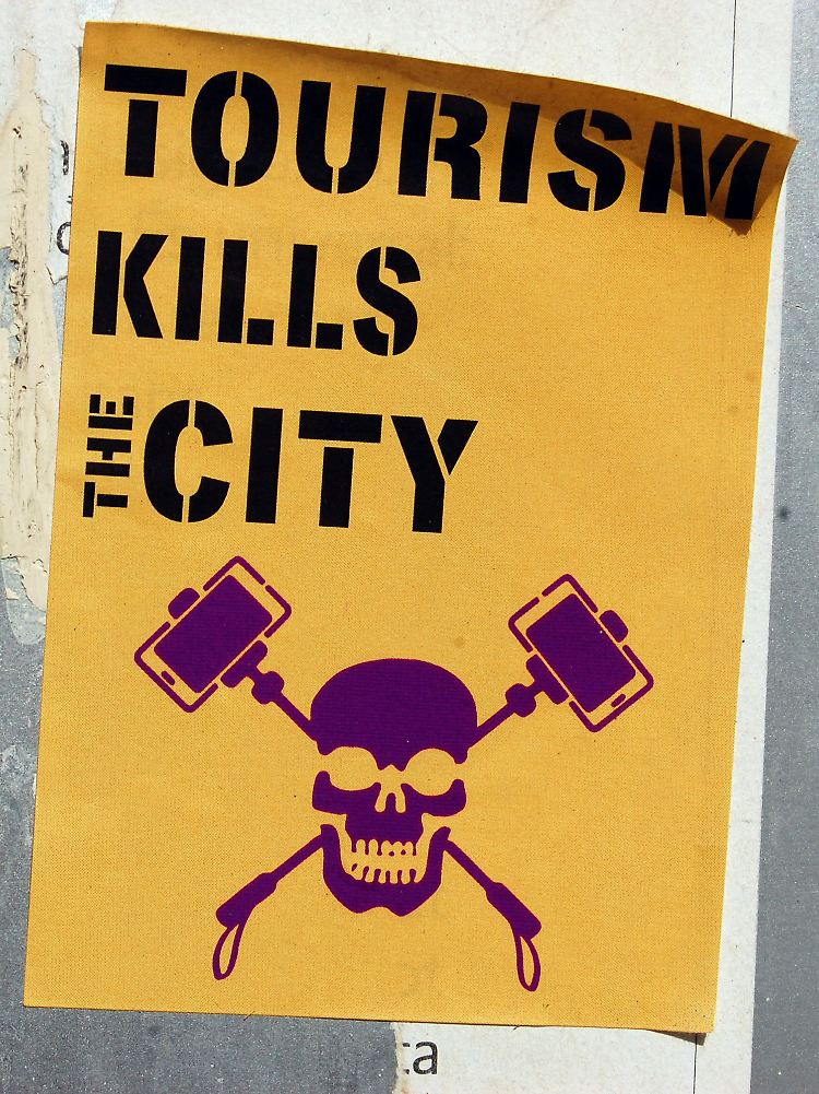 Aufkleber mit der Aufschrift "El Kapitalisme converteix el Viatger en Turista" ("Der Kapitalismus verwandelt den Reisenden in einen Touristen") in Palma de Mallorca.