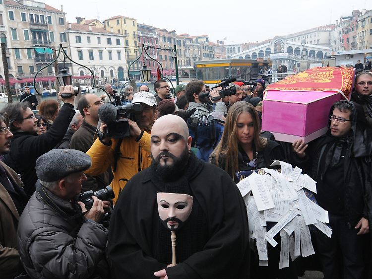 Mit einer symbolischen Trauerfeier haben die Bewohner von Venedig am Wochenende auf den Bevölkerungsschwund in der Lagunenstadt aufmerksam gemacht. Gondeln mit leeren Särgen, geschmückt mit üppigen Blumenkränzen, fuhren zum Klang venezianischer Gesänge und Gedichte über die Kanäle. Mehrere hundert Venezianer beteiligten sich an dem Trauerzug durch die bei Touristen beliebte Stadt, deren Einwohnerzahl kürzlich auf unter 60.000 gesunken war.