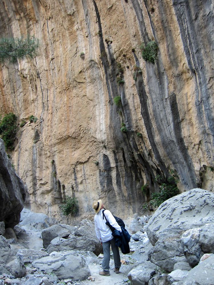 Hinter Samaria beginnt der spektakulärste Teil der Wanderung, die enge und tiefe Schlucht. Bis zu 100 Meter hoch türmen sich die Felswände auf beiden Seiten des Weges. Sie leuchten orange in der Sonne. Manche sind gemustert wie Tiger, mit schwarzen Streifen im Gestein.