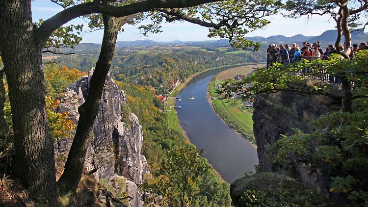 Ein Aussichtspunkt der Bastei in der Sächsischen Schweiz nahe Dresden.
