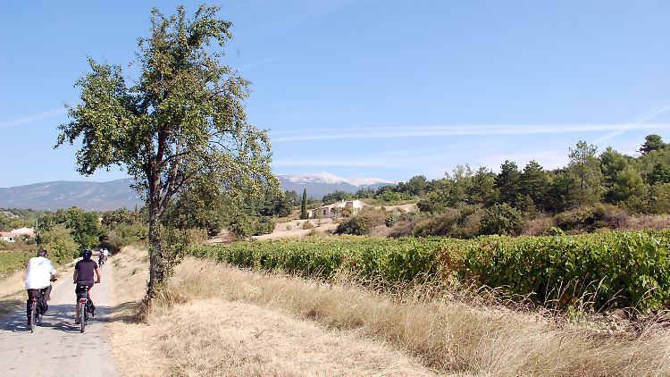 Links stehen Weinstöcke soweit das Auge reicht, rechts sind es Kirschbäume. Am Horizont ragt der gut 1900 Meter hohe Mont Ventoux in den Himmel über dem Vaucluse. Genau darauf zu bewegt sich eine Gruppe Radfahrer, die die Steigung mühelos nehmen und den Fahrtwind genießen. Kein Wunder, besonders anstrengend ist das nicht - am Hinterrad hilft ein Elektromotor, sich durch die Landschaft im Westen der Provence zu bewegen. Und so rauschen die Reisenden vorbei an Haselnusssträuchern und Steineichen, unter denen Trüffel wachsen.