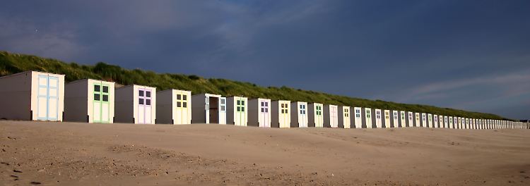 Hingucker unter blauem Himmel - auf Texel gibt es Strandhäuschen statt Strandkörbe, und das schon seit Langem.