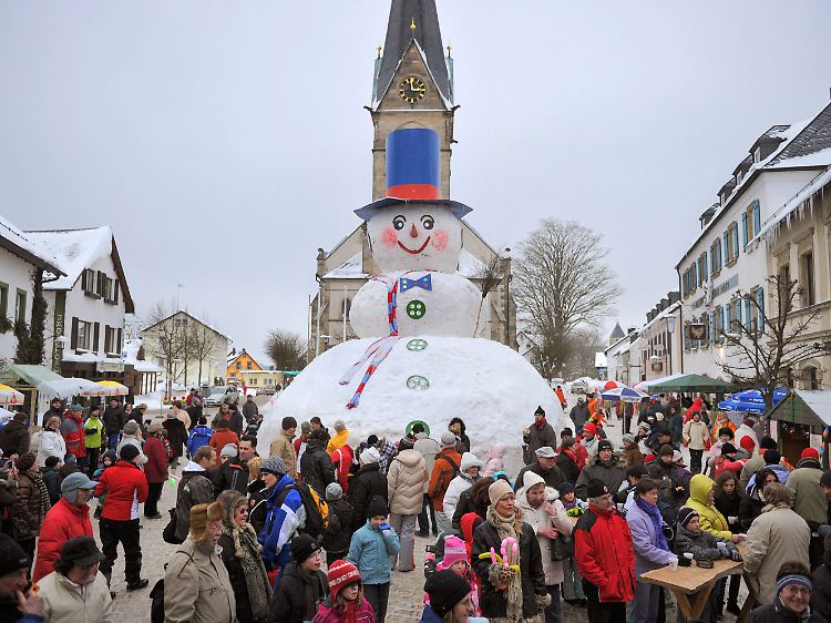 16.02.2010, 07:21 UhrDeutschlands angeblich größter Schneemann heißt "Jakob" und steht in Bischofsgrün (Bayern). Mit einer Höhe von 12 Metern und einen Umfang von 32 Metern soll er nach Angaben der Veranstalter der höchste Naturschneemann Deutschlands sein. Zu seinen Füßen haben die Bewohner der Ortschaft am Montag ihr traditionelles Schneemannfest gefeiert. Bereits zum 25. Mal wurde "Jakob" von Ehrenamtlichen auf dem Marktplatz errichtet. Rund 200 Tonnen Schnee haben sie dazu zu drei Kugeln aufgetürmt und mit Baggern befestigt.