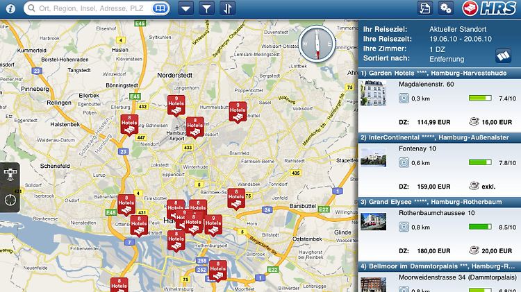 Hotelsuche per iPad: Wer wie zum Beispiel hier in Hamburg eine Übernachtungsmöglichkeit sucht, kann sich über Apps Vorschläge machen lassen.