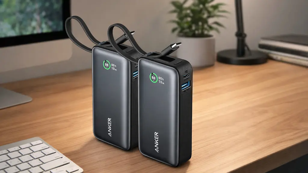 Die Powerbank 545 Nano von Anker hat eine Kapazität von 10.000 Milliamperestunden (mAh). Das reicht zum Beispiel, um ein iPhone 17 Pro Max zweimal fast komplett zu laden. Mit 30 Watt Ausgangsleistung ist das Handy je nach Modell innerhalb von 30 Minuten wieder bei knapp 50 Prozent Akku. Praktisch sind zudem das verbaute Display, das jederzeit über den Ladestand auf dem Laufenden hält, sowie das integrierte USB-C-Kabel.
