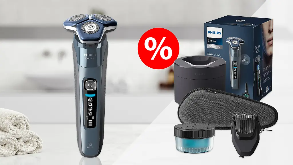 Der Philips-Rasierer arbeitet nach Hersteller-Angaben mit 45 selbstschärfenden Klingen, die bis zu 90.000 Mal pro Minute schneiden. Sensoren messen gleichzeitig die Haardichte, um die Schneideleistung automatisch anzupassen. Vielversprechend klingt zudem die Schutzbeschichtung, die aus 250.000 Mikroperlen pro Quadratzentimetern besteht und laut Philips Hautirritationen um bis zu 30 Prozent reduziert. Neben dem Rasierer selbst gehören zum Deal unter anderem noch ein Trimmer-Aufsatz, eine Lade- sowie eine Reinigungsstation und ein Reiseetui.