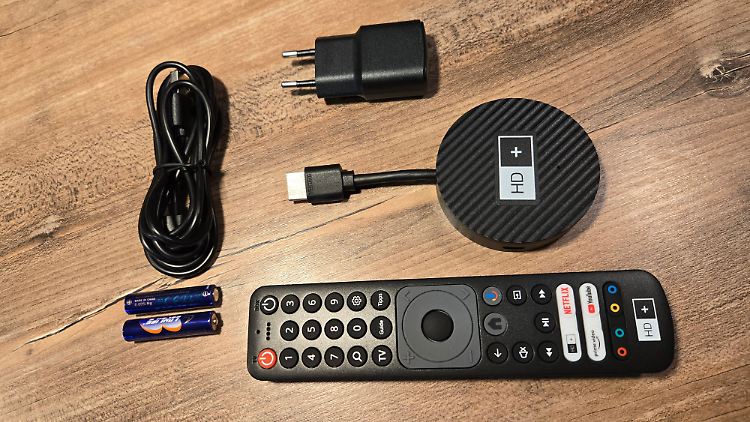 - Lieferumfang: TV-Stick, Fernbedienung, Verbindungskabel, Gutschein für drei Monate HD+ IP